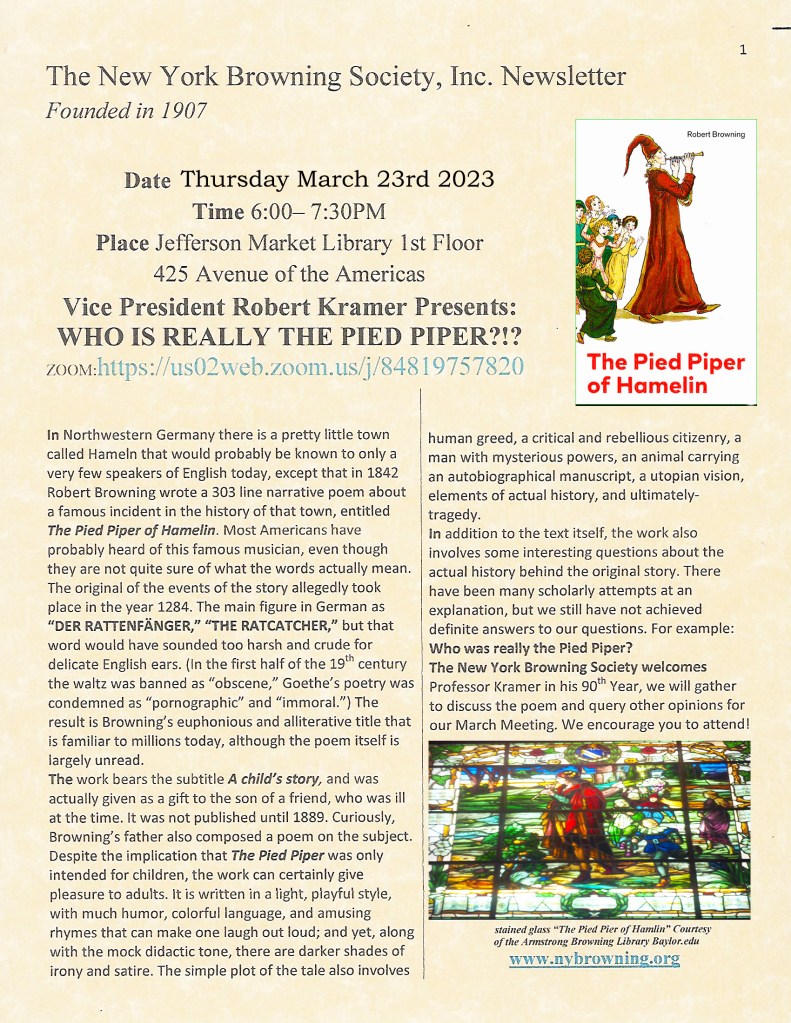 Vice President Robert Kramer presents: WHO IS REALLY THE PIED PIPER?!? 03/23/23 6pm! Posted bynybrowning1907March 13, 2023March 13, 2023Posted inUncategorized Share this: Click to share on X (Opens in new window) X Click to share on Facebook (Opens in new window) Facebook Like Loading... Related
