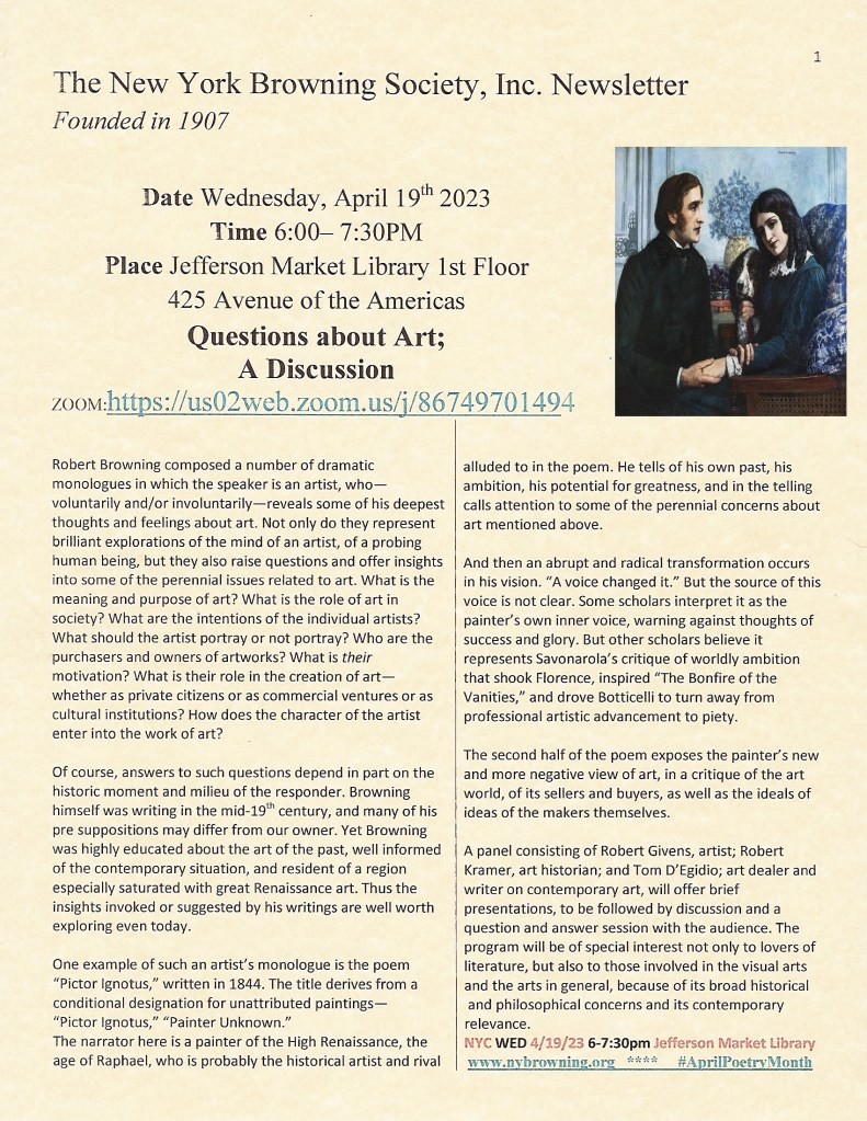 Questions about Art; A Discussion April 19th 2023 6pm Posted bynybrowning1907April 11, 2023April 11, 2023Posted inUncategorized Share this: Share on X (Opens in new window) X Share on Facebook (Opens in new window) Facebook Like Loading... Related