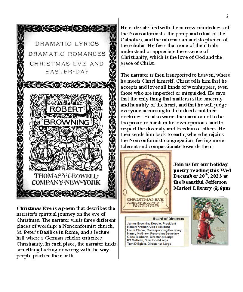 New York Browning Society Annual Holiday Poetry Reading 12/20/23 6PM! Posted bynybrowning1907December 15, 2023December 15, 2023Posted inUncategorized Share this: Click to share on X (Opens in new window) X Click to share on Facebook (Opens in new window) Facebook Like Loading... Related