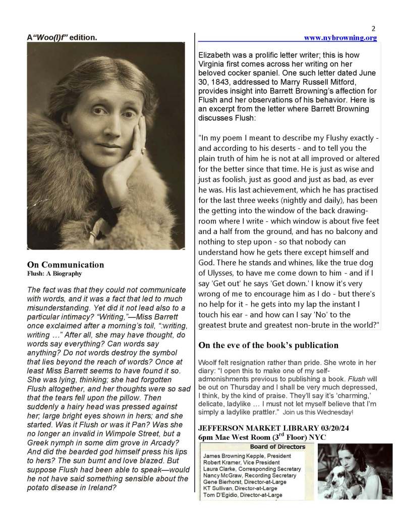 James Browning Kepple presents: Flush: A Biography – Virginia Woolf and EBB 03/20/24 6pm! Posted bynybrowning1907March 12, 2024March 13, 2024Posted inUncategorized Share this: Click to share on X (Opens in new window) X Click to share on Facebook (Opens in new window) Facebook Like Loading... Related